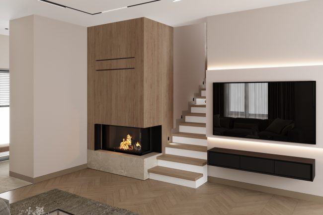 У великій вітальні встановлений кутовий модульний сірий диван, який надає комфорт та затишок. Зона дивану оздоблена вертикальними рейками з підсвіткою, що створює атмосферу сучасності та стилю. Камін, вбудований в колону, оздоблений широкоформатною плиткою під дерево, що створює затишок та розкішний акцент.