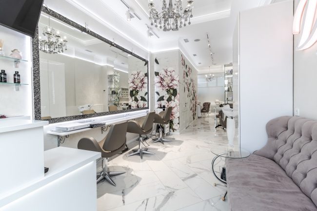 Зона для перукарів розташувалася вздовж стіни, на якій висить величезне прямокутне дзеркало у сріблястій рамі. Поверхня стін чергується з великими скляними панелями, оздобленими декоративними ромбами.
