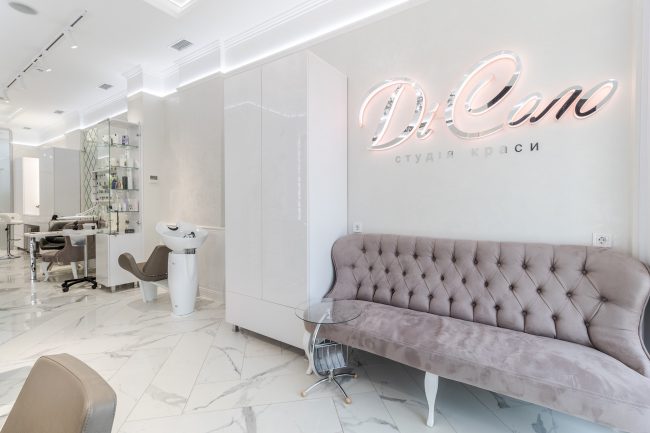 Ексклюзивний дизайн інтер’єру салону краси DISOLO промовисто показує призначення закладу. Він вишуканий, гармонійний, наповнений світлом. Тут панує білий колір у всьому — на поверхнях стін, стелі, меблів та навіть підлоги. Однак ця монополія сліпучо-білого урізноманітнюється острівцями кавового та блиском хромованого металу — ніжок стільчиків та крісел, вишуканих світильників з гронами кришталю, скляних стелажів для брендової продукції.