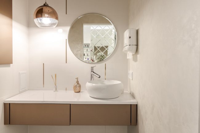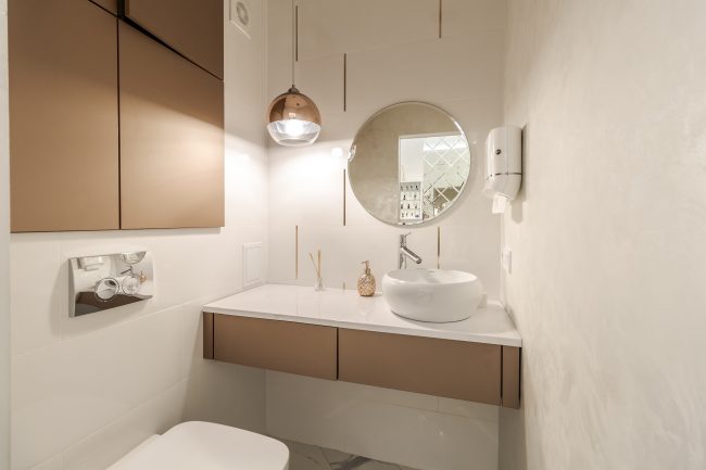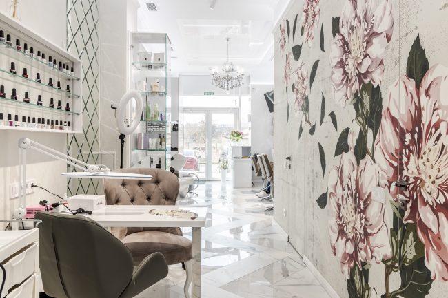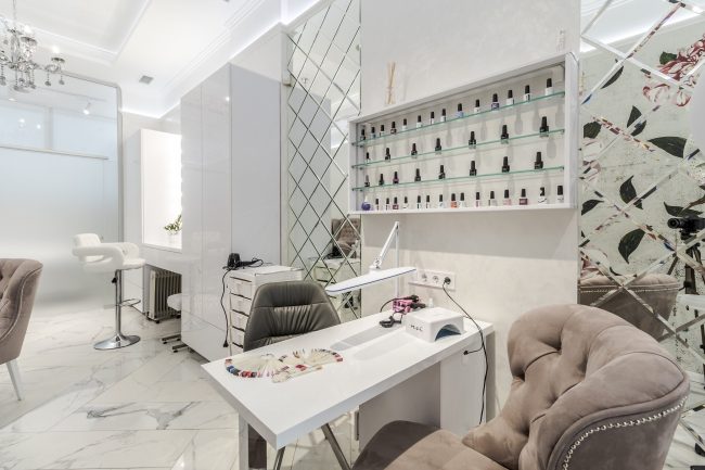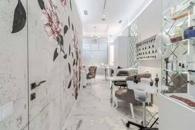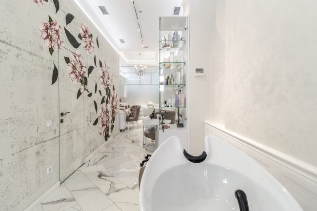 Незважаючи на складну конфігурацію приміщення, вдалося досягнути продуманого зонування та зручно розташувати меблі. Навпроти зони манікюру — акцентна стіна з зображенням квітів в пастельних тонах. В ній приховуються двері до санвузла, оформленогов тій же кольоровій гамі, однак із додаванням золотистого замість срібла. Загальну концепцію інтер’єру салону краси продовжують навіть скляний дозатор для рідкого мила, який завдяки золотистому забарвленню та рельєфній поверхні стає важливим аксесуаром.