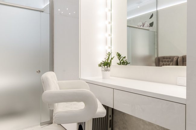 Біля входу знаходиться столик для адміністратора, навпроти нього під стіною — зона очікування, де можна відпочити, сидячи на комфортабельному дивані та поклавши сумочку чи телефон на вишуканий скляний столик. Біля нього ж розмістилася шафа для одягу та інших речей клієнток.