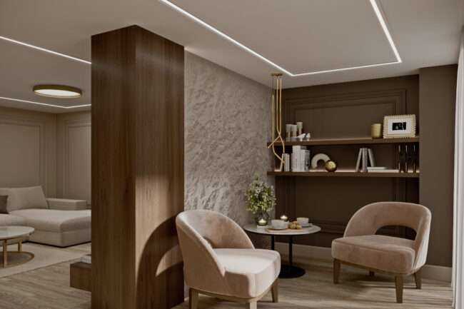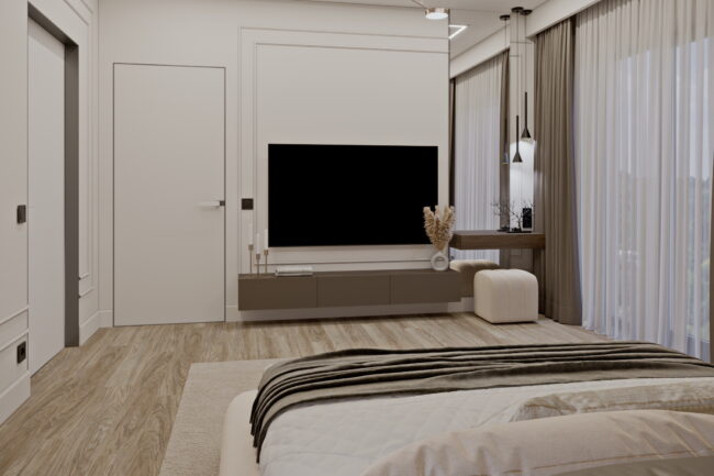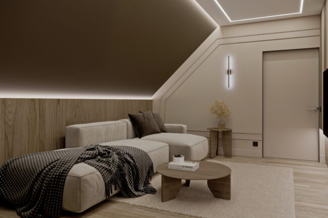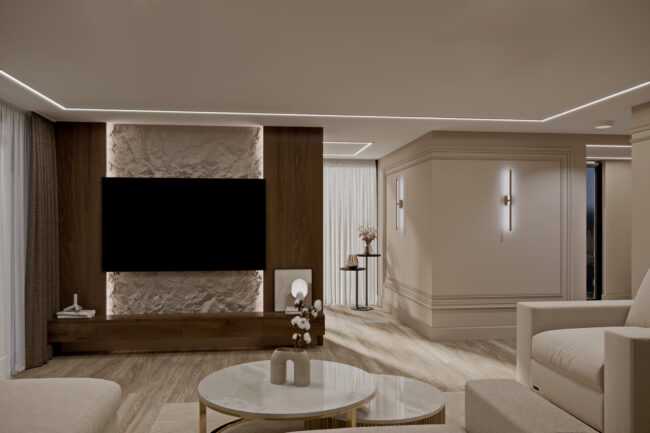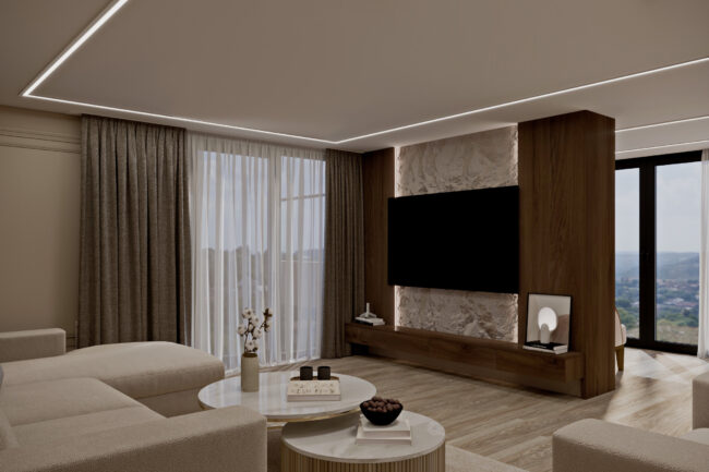 ✔ Зона для перегляду кіно – великий ТВ на акцентній стіні, комфортний диван та журнальний столик.