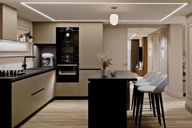 ✔ Кухонний гарнітур у світлих тонах із чорними акцентами та вбудованою технікою.
