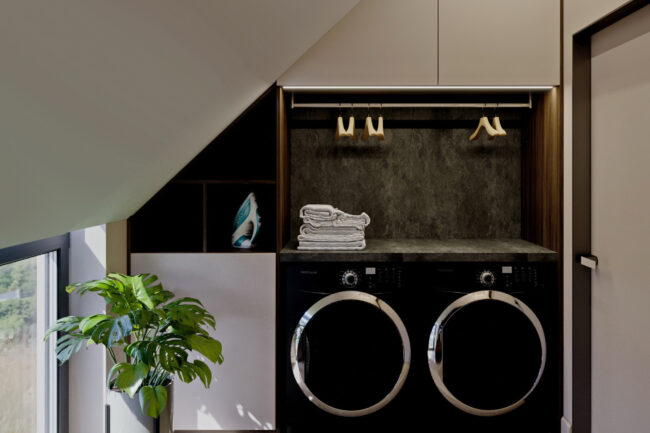 ✔ Пральна кімната – сучасна техніка, місце для сушіння речей та системи зберігання.