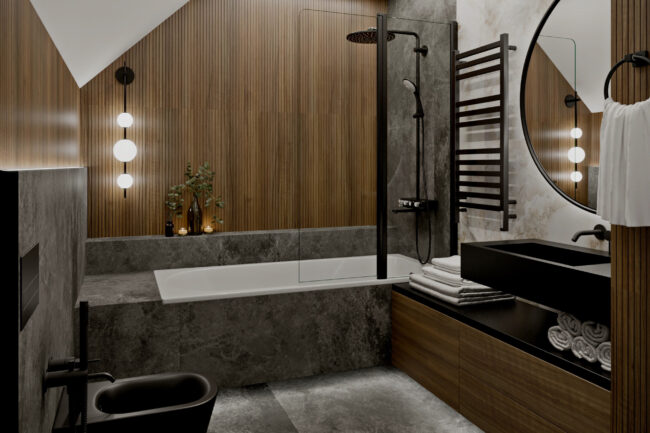 ✔ Темний камінь, дерев’яні панелі та чорна сантехніка створюють розкішний контраст.