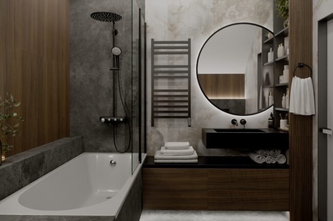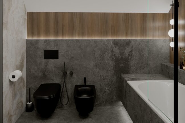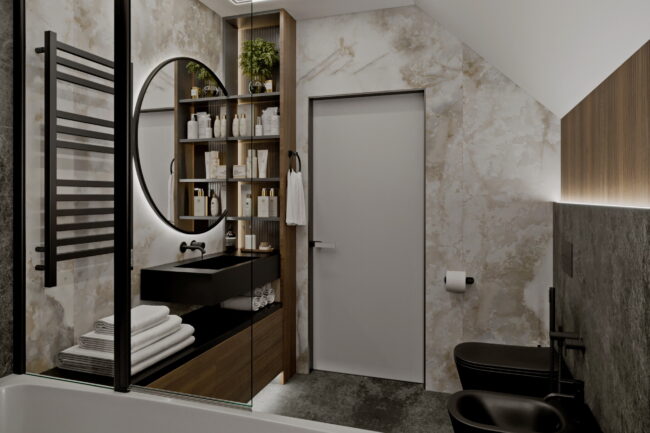 ✔ Контрастний дизайн – чорна сантехніка, дерев’яні панелі та світлі текстури.
