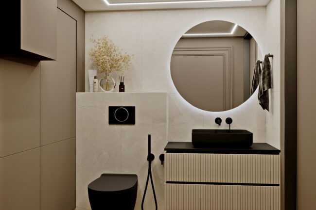 🔹 Ванна кімната – гармонія елегантності та природних матеріалів.