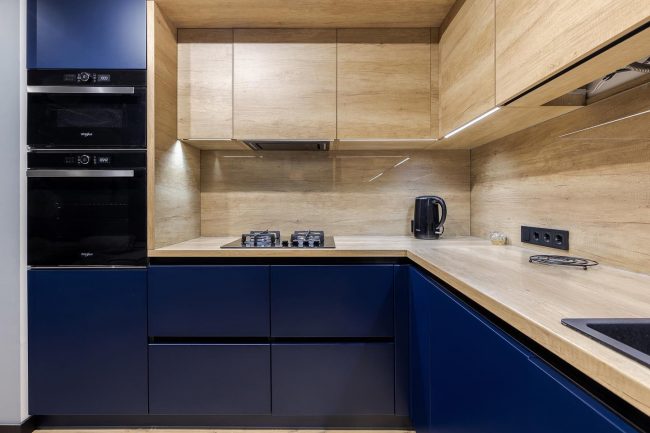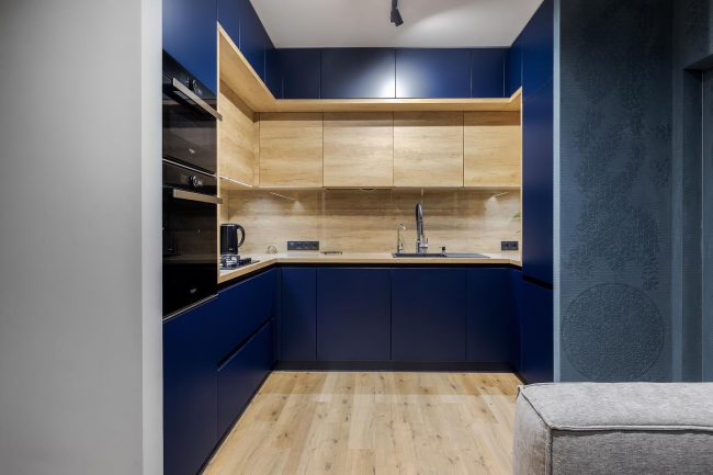 Дизайну кухні вигідно підкреслює світле натуральне дерево заглибленої середньої частини гарнітура, текстура якого ще виразніше проявляється лінійною підсвіткою, обрамлене темно-синіми матовими фасадами нижніх тумбочок, вертикальними площинами справа та зліва і антресольними шафками вгорі під стелею. Симетрично до розміщеного справа високого вмістимого двокамерного холодильника зліва встановлено духовку та мікрохвильову піч.