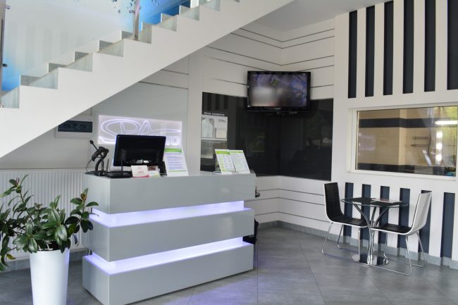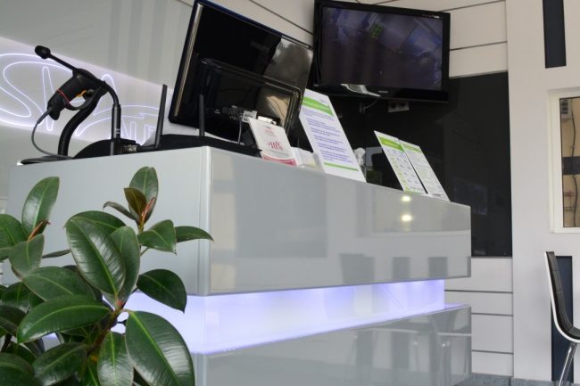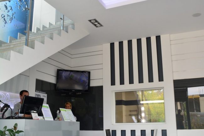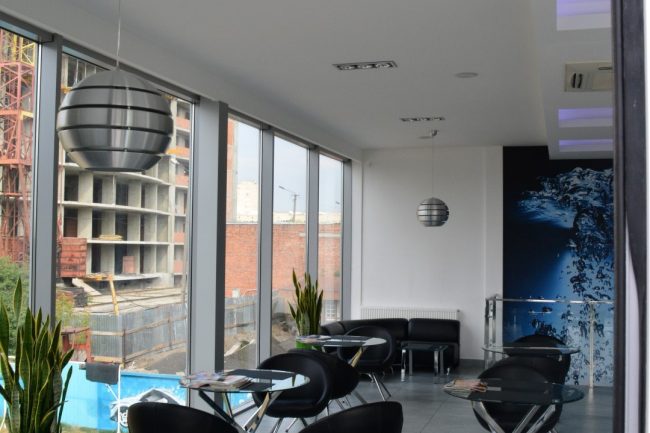 Ми підібрали меблі строгих обрисів, витримані у відтінках білого, сірого, чорного. Для відпочинку відвідувачів ми створили кілька зон з кріслами та столиками. Тут можна посидіти. випити кави, зручно розташувавшись в м’яких півкруглих кріслах, та на стільчиках, сидіння яких обтягнуті чорною еко-шкірою, а зовні — білою. Блиск хромованого металу повторюється на ніжках стільців, крісел та перил на сходах, що ведуть на другий поверх. Прозорі столи з скла надають інтер’єру родзинки. В одному з куточків приміщення розташувався великий чорний диван, обтягнутий якісною чорною шкірою.