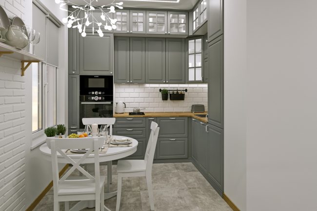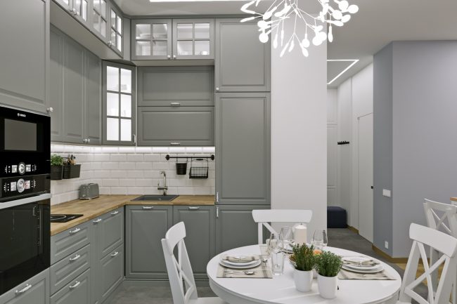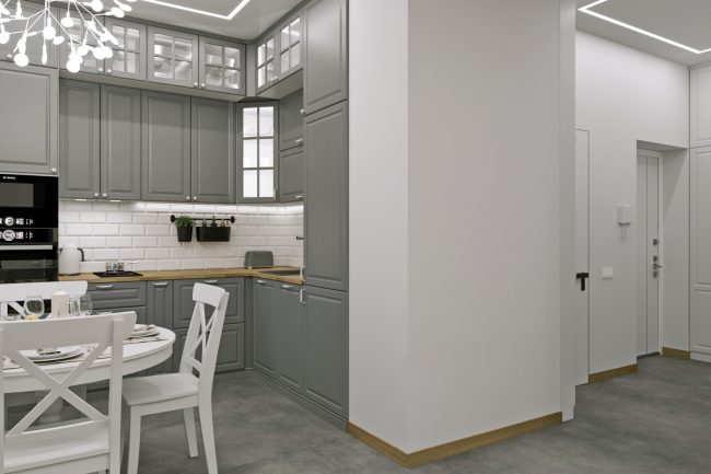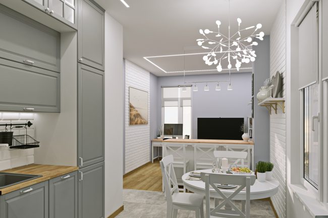 Зону кухні визначає використання білої цегли та фасадів, мальованих у сірий колір. Барна стійка розділяє кухню та вітальню, створюючи затишну атмосферу для прийому їжі. Підсвітка антресолі додає атмосфери.