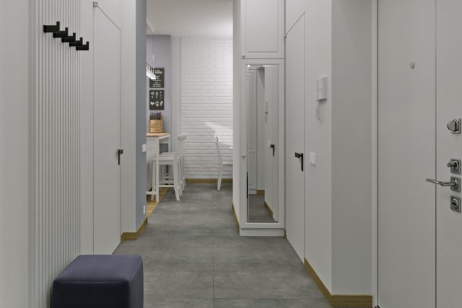 Коридор у білих тонах з сірою плиткою на підлозі вражає своєю простотою та функціональністю. Місце для роздягання з пуфом та гачками у білих рейках – це не лише практична, але й стильна деталь. Приховані двері додають відчуття легкості.