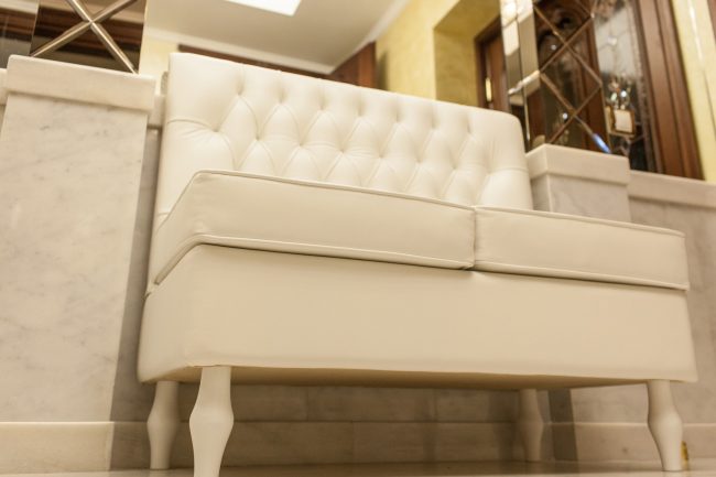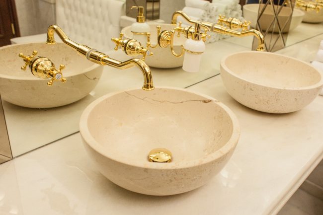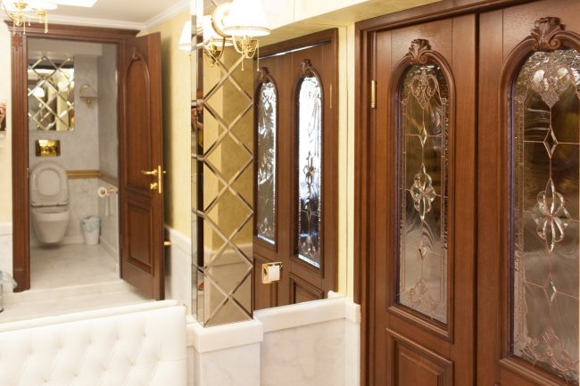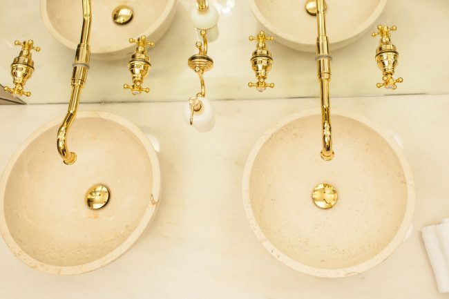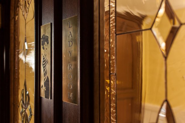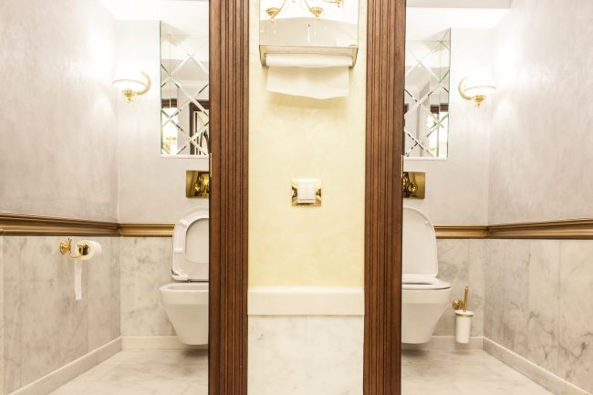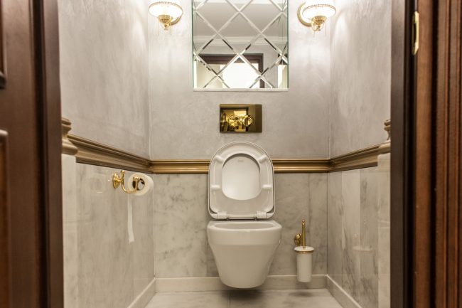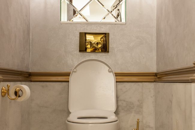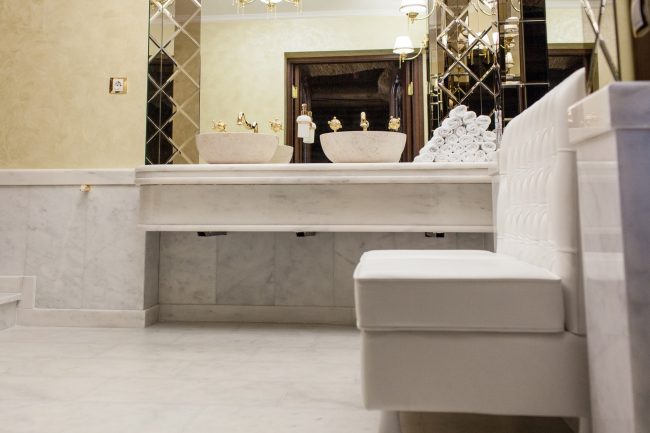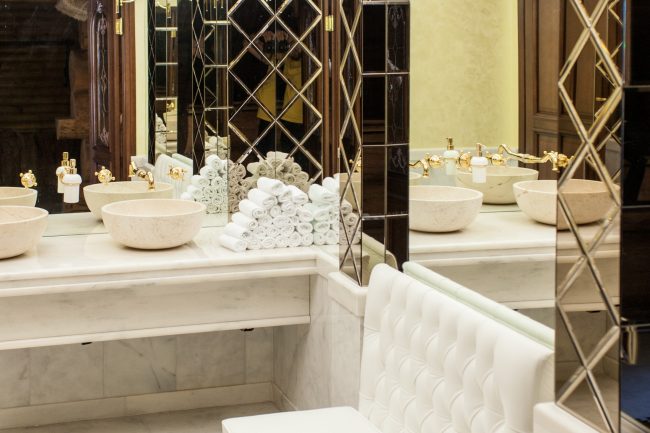 Турбота про затишний, комфортний відпочинок проявляється в розкішному оформленні туалетів: дорогих дзеркалах, викладених фацетованими ромбами, золочених вінтажних кранах, облицюванні мармуровою плитою.