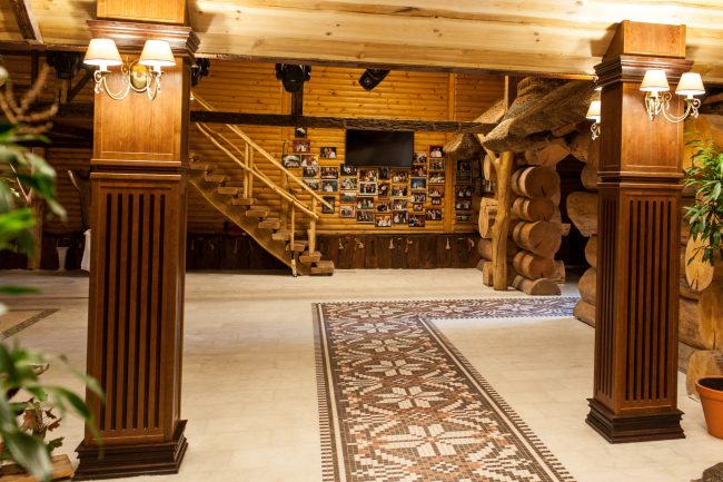 Розкішні вхідні двері з дорогою різьбою, із вставками вітражного скла, відкривають перед гостями світ забутої старовини, відомої нам з музеїв старожитностей. Гостинно запрошуючи вглиб ресторану, вздовж підлоги простягається мозаїчна доріжка з натурального мармуру, що символізує вишивку хрестиком.
