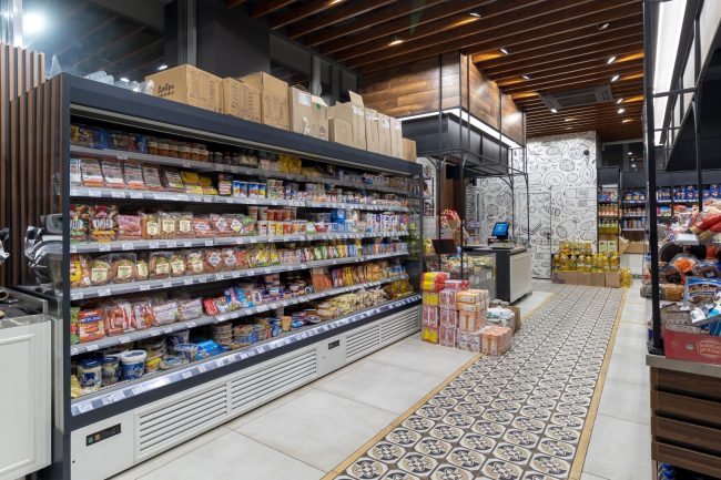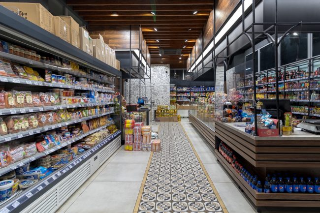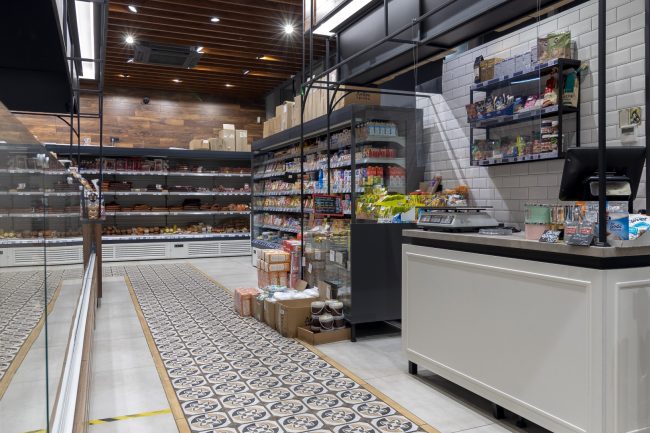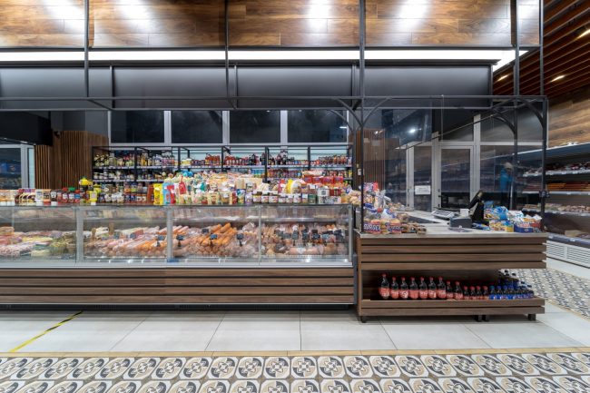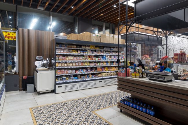 Місце для електронної ваги, де покупці можуть зважити вибрані продукти, виділено за допомогою дерев’яної панелі, що нагадує розташовану біля каси, однак тут лінії стали вертикальними.
