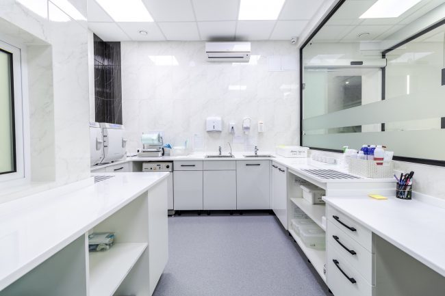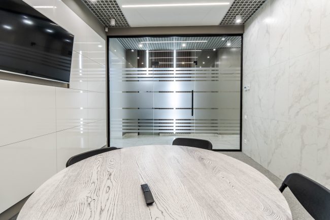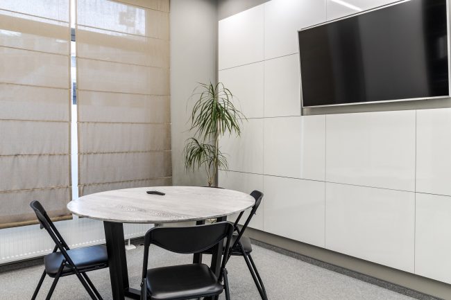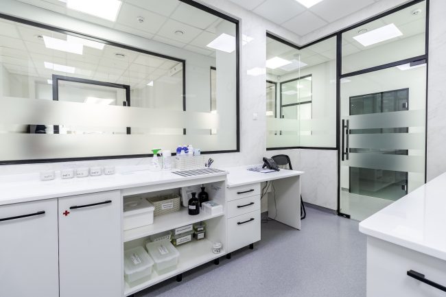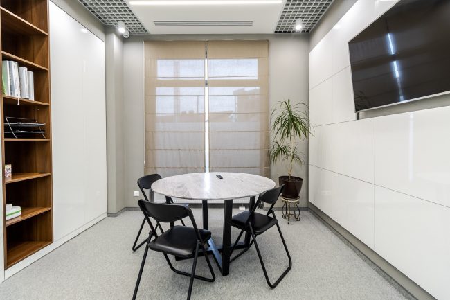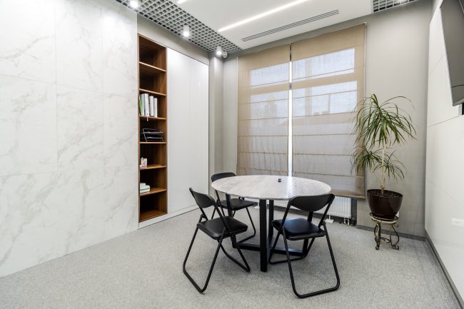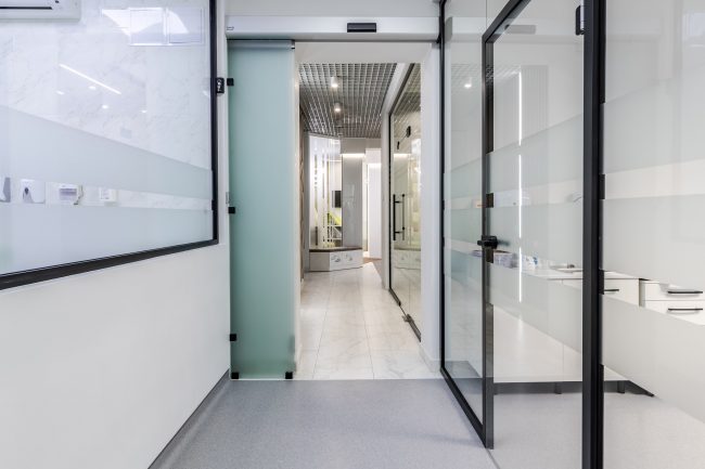 Інтер’єр кабінетів підкреслює чистоту та фаховість — тут практично всюди панує білий колір. Контрастними ділянками є лише вертикальні колони обабіч вікон, чорні ручки дверцят шафок та рами дзеркал. Кабінети відокремлені скляними дверима. Висока скляна перегородка відмежовує кабінет для нарад. Дизайн інтер’єру СТОМАТОЛОГІЧНОГО ЦЕНТРУ SYMBIOTIKA це вийнятково лаконічний і довершений проект, що може бути еталоном у розробці проектів такого спрямування