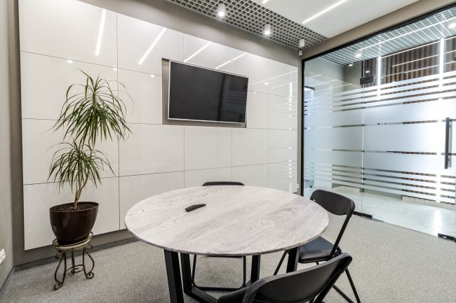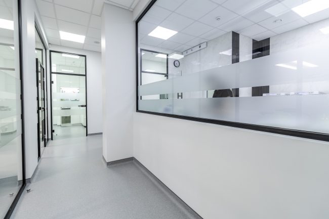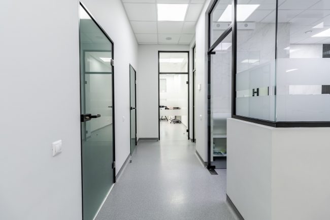 Дизайн стелі однаковий на території коридорів — біля решітка приховує світильники, що закріплені на темному тлі. В кабінетах надали перевагу використанню білих квадратних стельових панелей.