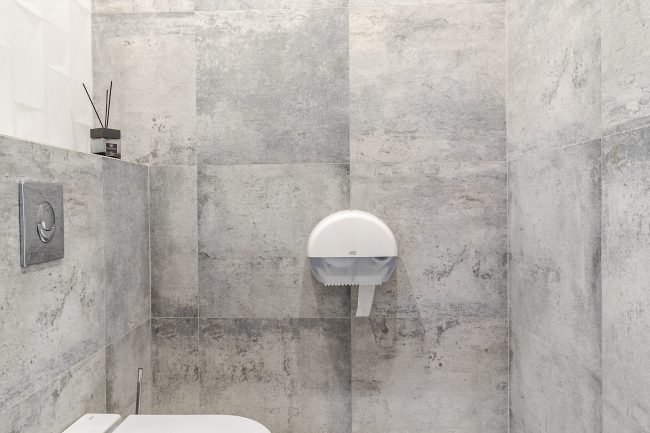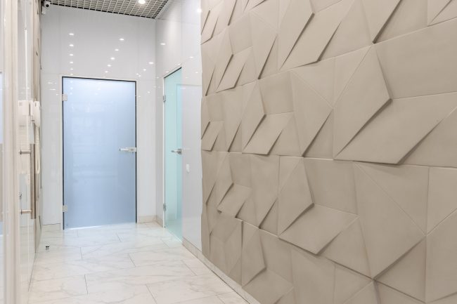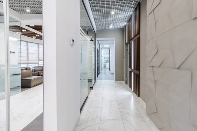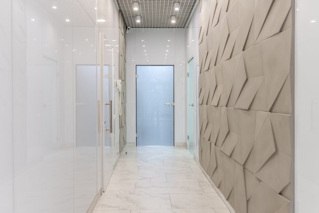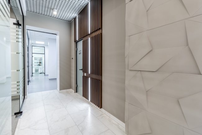 Широкі коридори позбавлені всього зайвого. Однак їх не можна вважати одноманітними — цікавим рішенням стало використання декоративних елементів плитки, яка створю рельєфну стіну, що нагадує природний камінь з регулярними гранями.