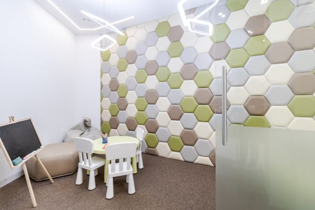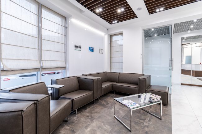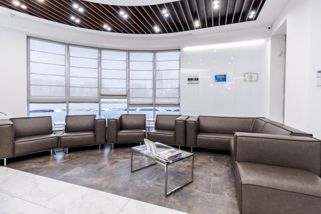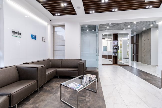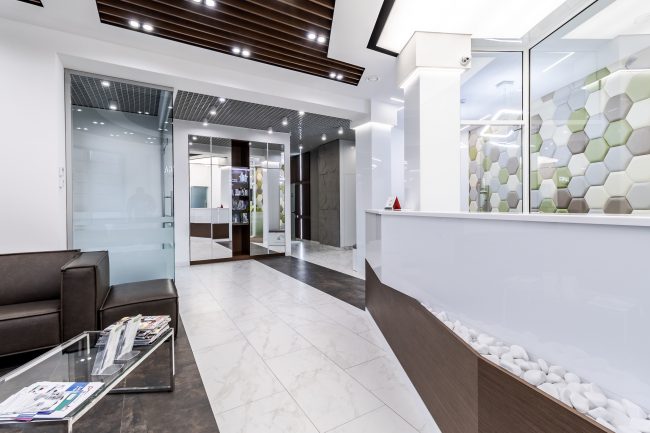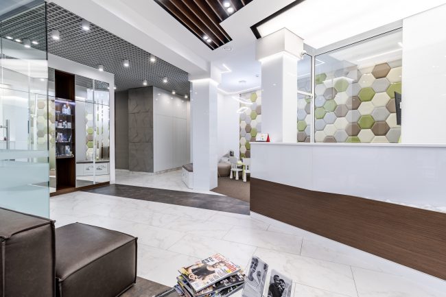 Рецепція включає велику стійку для кількох адміністраторів, яка чітко відокремлена від зони очікування за допомогою оздоблення підлоги плиткою різного орнаменту та кольору. М’які дивани та крісла розташувалися великим півкругом під стінами, вони підібрані у тому ж відтінку, що й панель з імітацією натурального дерева в нижній частині стійки адміністраторів. Живі рослини сприяють зниженню стресу та налаштуванню на приємні думки.