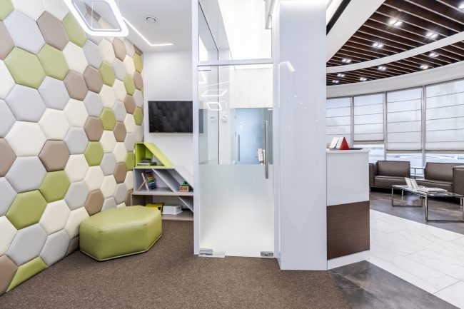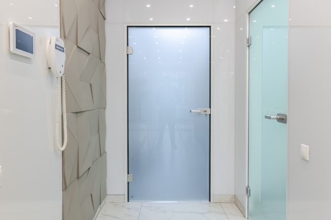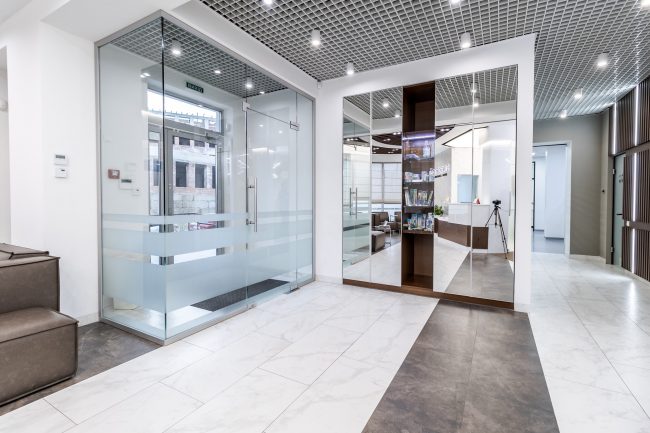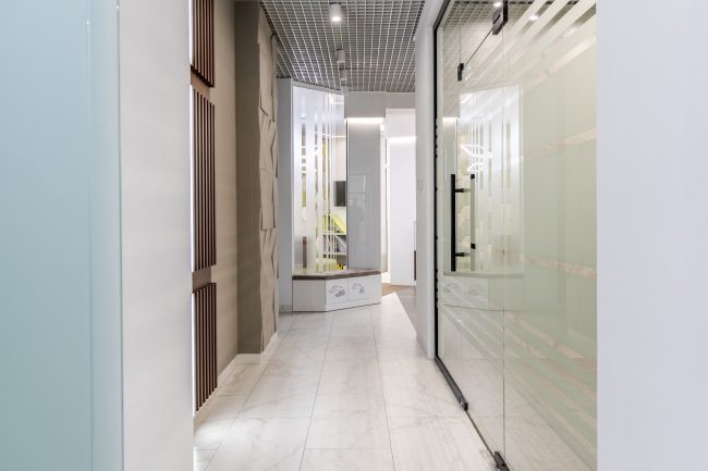Вхід оформлено у вигляді бокса, стінки якого створені скляними панелями. Дизайн холу передбачає створення для відвідувачів комфортної зони, де можна зачекати прийому. Ліворуч від входу — шафа-купе із дзеркальними дверцятами. До холу та рецепції можна потрапити, повернувши праворуч.