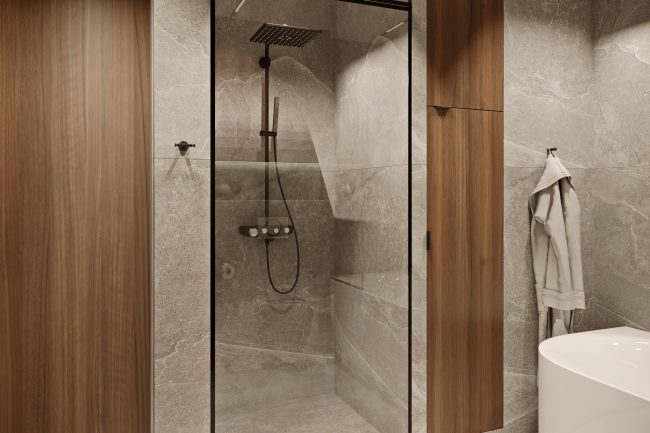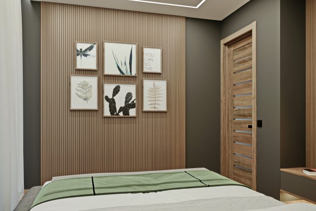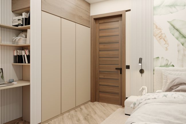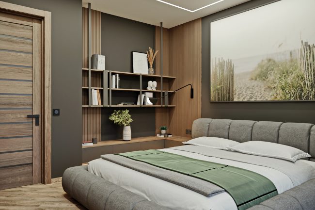 Спальня оформлена в спокійних тонах з використанням природних матеріалів. Тут розміщене комфортне двоспальне ліжко з м’яким головою, що створює затишну атмосферу для відпочинку. Шафа з дерев'яними фасадами гармонійно вписується в інтер’єр, надаючи достатньо місця для зберігання речей.