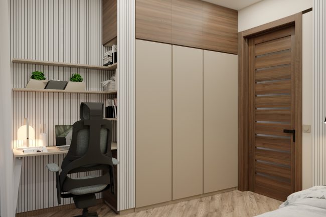 Дитяча кімната вражає своїм дизайном та функціональністю. Вона обладнана односпальним ліжком, затишним куточком для відпочинку та робочим столом, що створює ідеальні умови для навчання та творчості. Яскраві акценти у декорі надають кімнаті життєрадісного настрою.